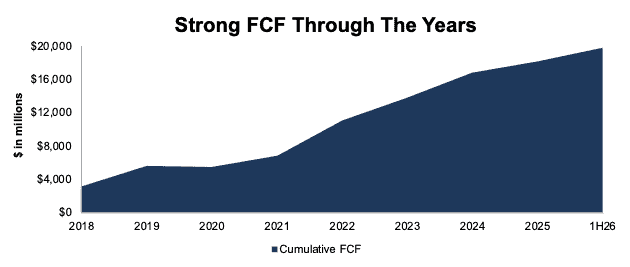 The company generated a cumulative $19.8 billion (28% of enterprise value) in FCF from fiscal 2018 through fiscal 2Q26. In the first two quarters of fiscal 2026 alone, the company generated $1.6 billion in FCF. See Figure 2.