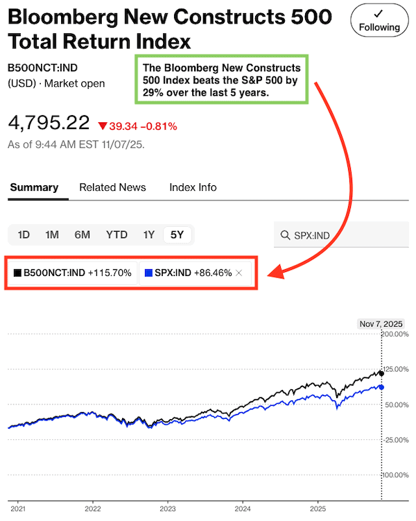 Figure 5: Bloomberg New Constructs 500 Index Strongly Outperforms the S&P 500: Last Five Years