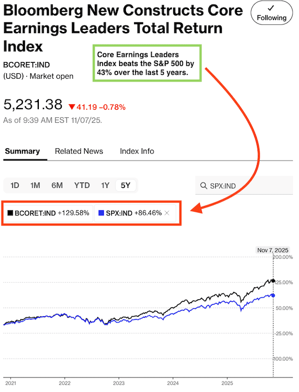 Figure 3: Bloomberg New Constructs Core Earnings Leaders Index Outperforms S&P 500: Last 5 Years