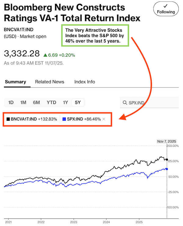 The “Very Attractive Stocks” Index, which allocates to stocks that get a Very Attractive rating by our AI Agent for Investing, beat the S&P 500 by 46% over the last five years. Bloomberg’s official name for the index is Bloomberg New Constructs Ratings VA-1Index (ticker: BNCVAT1T:IND). Figure 4 shows it was up 133% while the S&P 500 was up 86%.