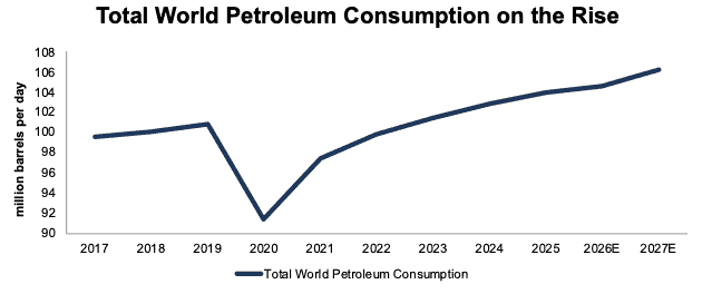 Even after the closure, the U.S. Energy Information Administration (EIA), in its April Short-Term Energy Outlook, projects global crude oil and liquid fuel consumption to grow by approximately 1% and 2% in 2026 and 2027, respectively. See Figure 1.