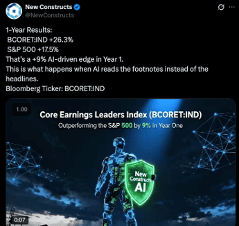 Real-Time Validation: The Bloomberg New Constructs Core Earnings Leaders Index (BCORET:IND) beat the S&P 500 by 9 percentage points in its first year (+26.3% vs. +17.5%). This is the same Core Earnings methodology that powers the Power Pack.