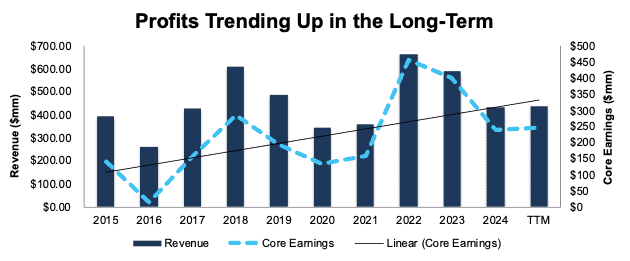 While profits are down from record 2022 levels, the company continues to generate strong Core Earnings and free cash flow (more on that later). The company generated $245 million in Core Earnings in the TTM ended 2Q25, which is higher than any other year in our model except 2022 and 2023.