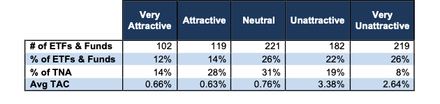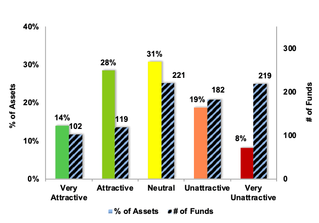 This table shows that only the best of the best funds get our Very Attractive Rating: they must hold good stocks AND have low costs.