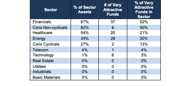 Figure 4 presents a mapping of Very Attractive funds by sector. The chart shows the number of Very Attractive funds in each sector and the percentage of assets in each sector allocated Very Attractive-rated funds.