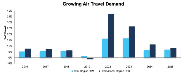 *We exclude COVID’s impact in 2020 and 2021 on air travel for visualization purposes. For reference, this region’s total RPK fell 57% and 23% YoY in 2020 and 2021, respectively while the region’s international RPK fell 76% and 40% YoY over the same time.