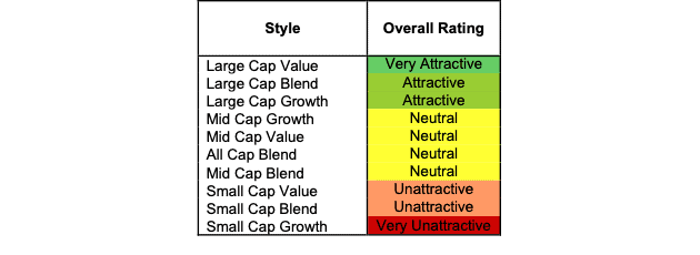 At the beginning of 4Q25, the Large Cap Value, Large Cap Blend, and Large Cap Growth styles earn an Attractive-or-better rating. Our style ratings are based on a normalized aggregation of our fund ratings for every ETF and mutual fund in a given style. Our fund ratings are based on aggregations of the ratings of the stocks they hold. See last quarter’s Style Ratings here.