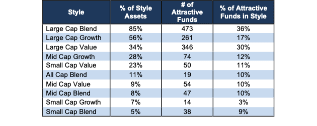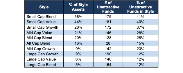 The landscape of style ETFs and mutual funds is littered with Unattractive funds. Investors in Small Cap Blend have put over 58% of their assets in Unattractive-rated funds.