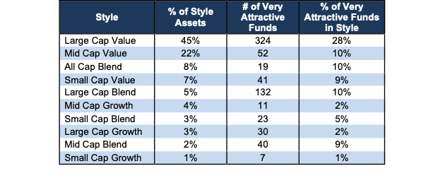 Figure 4 presents a mapping of Very Attractive funds by investment style. The chart shows the number of Very Attractive funds in each style and the percentage of assets allocated to Very Attractive-rated funds.